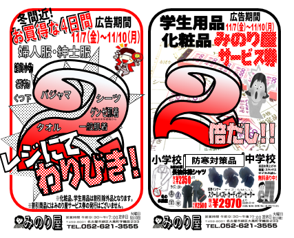 が・・・化粧品・学生用品は【みのり屋サービス券】2倍発行!